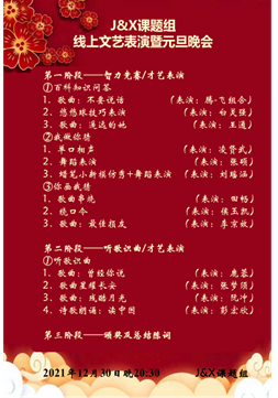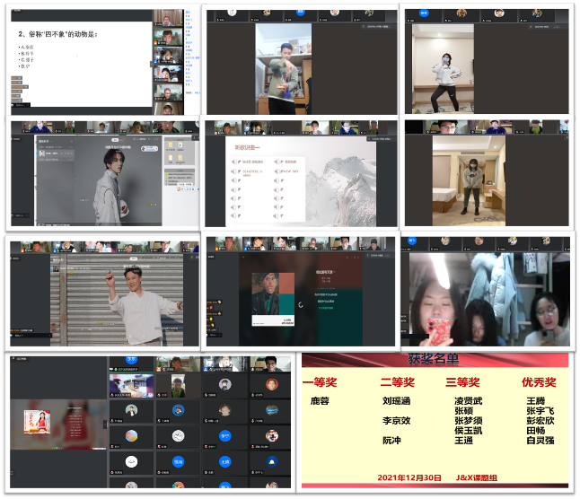 研究生文艺晚会主要包括知识问答、我做你猜、你画我猜、听歌识曲和才艺表演五种形式。晚会开始,主持人介绍了晚会内容和参与人员,随后鹿蓉和吴旺杰等同学进行知识抢答,带动了大家参与知识竞赛的积极性;王腾和张宇飞合唱《不要说话》,将全场氛围推向燃点;白灵强进行了高难度的悠悠球表演,引得大家一片喝彩;凌贤武的单口相声让大家爆笑连连;田畅和舍友献唱的歌曲串烧得到了大家的阵阵欢呼;张硕和刘瑶涵的舞蹈将晚会气氛推到了高峰。在一片欢乐中,大家纷纷献上才艺,最后蒋玮和肖晶晶老师进行了线上颁奖和总结陈词。晚会持续两个半小时,尽管是在线上举行,依然挡不住师生在新年之际的高涨热情和频频互动,最后在大家的意犹未尽中走向尾声。