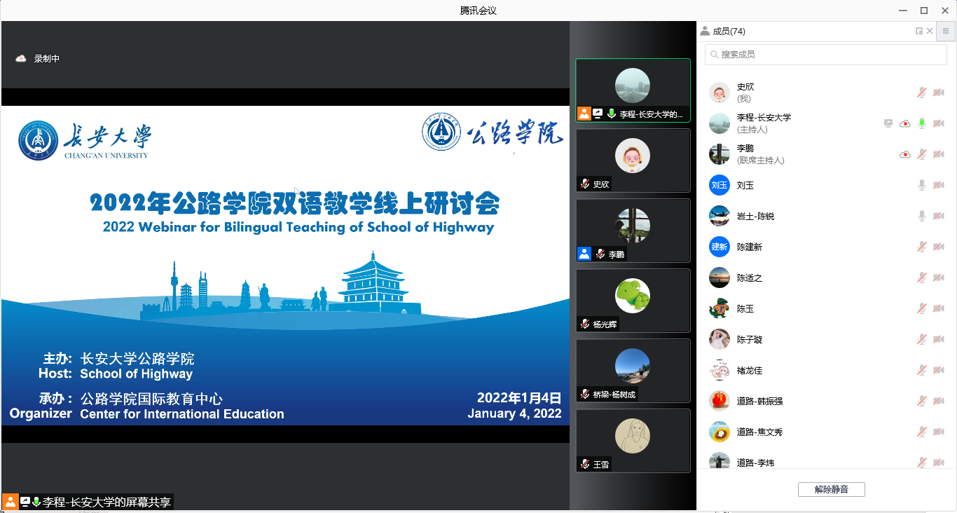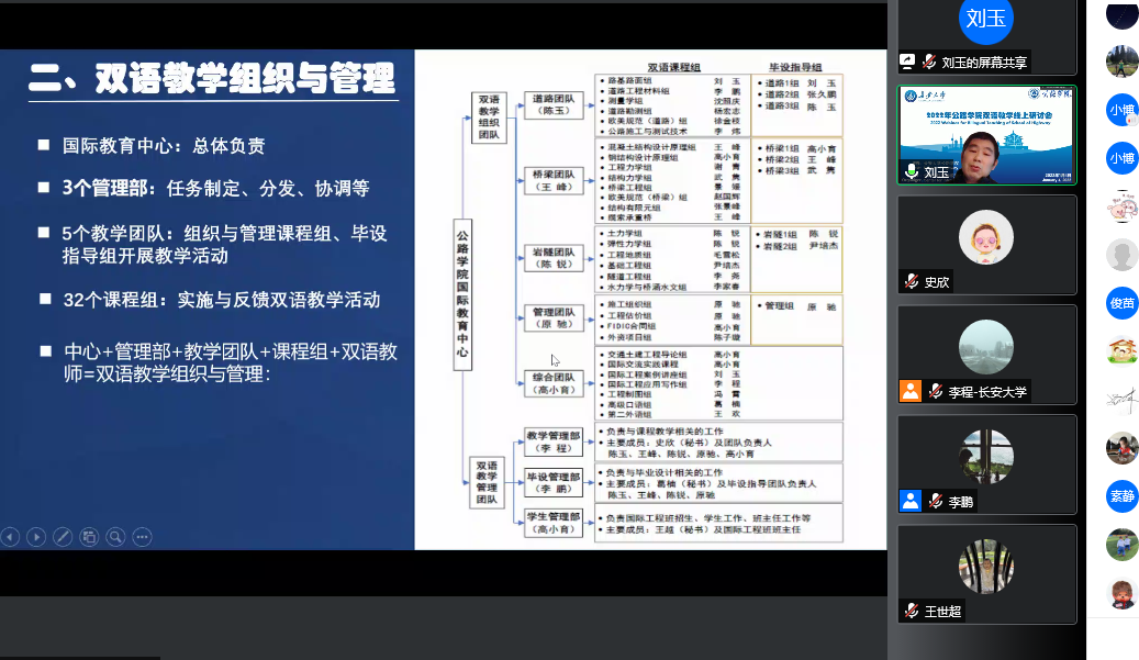 国际教育中心主任刘玉介绍了《beat365正版唯一官网必一双语教学管理办法》,重点解读了双语教学组织与管理、双语教学基本要求、全英毕业设计基本要求、双语课程教学工作量考核与分配、全英毕业设计(论文)工作量考核与分配等关键内容。他强调双语教学的核心是专业内容,特色是双语,需要强化“专业能力”和“语言能力”的融合式培养。随后按照道路、桥梁、岩隧、管理与综合四个线上分会场,与会人员对新修订的《beat365正版唯一官网必一双语教学管理办法》进行了深入研讨和交流,为进一步完善双语教学管理提出了很多切实可行的建议和举措。