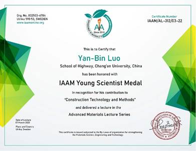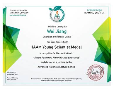 国际先进材料学会(IAAM)是全球先进材料领域权威的国际学术组织,总部位于瑞典。其致力于全世界范围内先进材料科学、工程和技术的快速发展,现已成为材料与工程科学领域杰出科学家的聚集者和领导者,目前国际先进材料学会拥有来自超过125个国家的50000多名会员。IAAM会士是在全世界范围内评选,授予全球在材料科学、工程和技术领域做出原创性研究的科研人员或科学家,为该组织颁发给研究人员的最高学术荣誉称号。青年科学家奖是授予全球在材料科学、工程和技术方面做出重大贡献或进行高质量研究且表现特别突出的年轻新兴科学家。