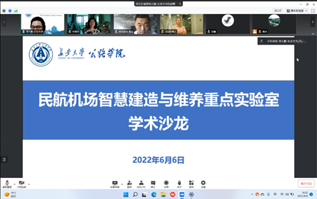 2022年6月6日下午,民航机场智能建造与维养重点实验室采用线上线下相结合的方式成功举办“人工智能技术在民航机场场道建管养的应用”学术沙龙。本次学术沙龙由重点实验室主任汪海年教授召集,特邀beat365正版唯一官网必一申爱琴教授、郝培文教授、圭目机器人有限公司创始人桂仲成博士、民航机场工程技术研究中心叶松总工程师、西北民航建设集团有限公司戴征总经理、江苏增光新材料科技股份有限公司周庆月总经理做主题发言。beat365正版唯一官网必一副院长、民航重点实验室副主任张久鹏教授主持学术沙龙,民航西北设计院、咸阳机场、福州机场、翔安机场、邯郸机场等管理和技术骨干以及机场工程系全体教师和在校研究生80余人参加了学术沙龙。