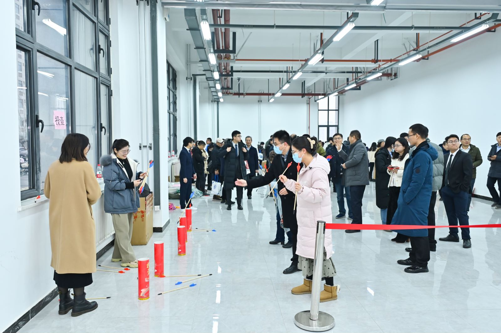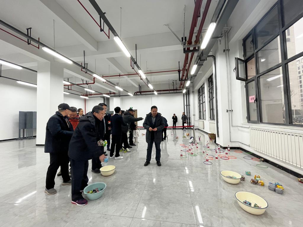 联欢会前,教职工进行游园活动,参与丢沙包、投壶、套圈、踢毽子、夹乒乓球等娱乐活动。