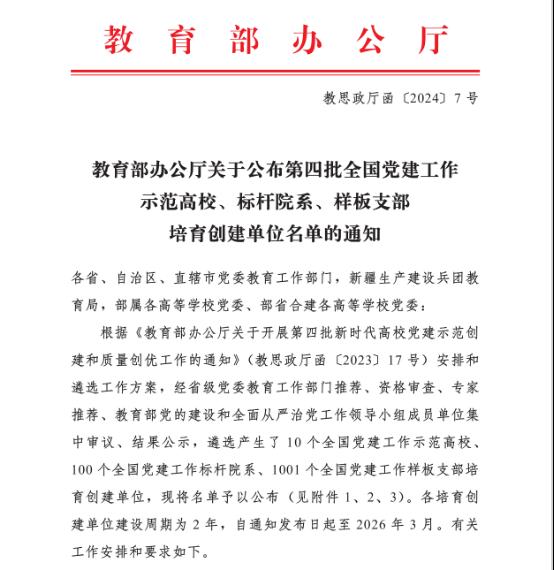 4月16日,教育部思想政治工作司发布《教育部办公厅关于公布第四批全国党建工作示范高校、标杆院系、样板支部培育创建单位名单的通知》(教思政厅函〔2024〕7号),经省级党委教育工作部门推荐、资格审查、专家推荐、教育部党的建设和全面从严治党工作领导小组成员单位集中审议、结果公示,遴选产生了10个全国党建工作示范高校、100个全国党建工作标杆院系、1001个全国党建工作样板支部培育创建单位。beat365正版唯一官网必一党委入选“全国党建工作标杆院系”培育创建单位。