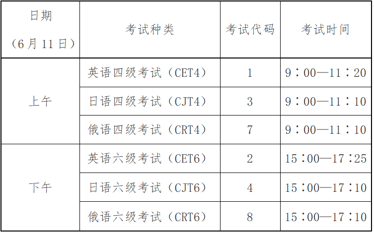英语四级口语考试(CET-SET4)考试时间为5月21日(F221次),英语六级口语考试(CET-SET6)考试时间为5月22日(S222次),具体场次安排如下: