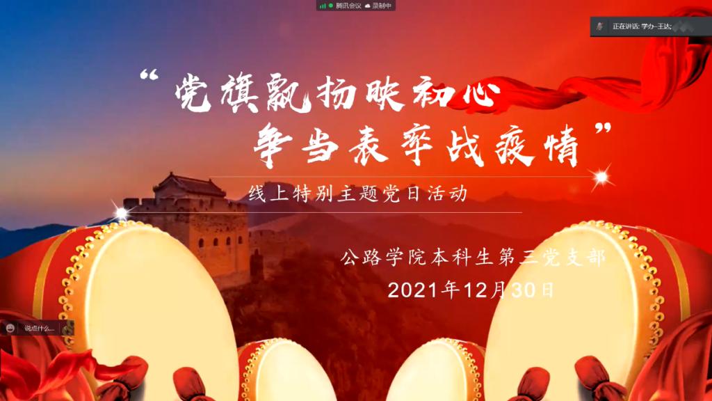 2021年12月14日,新冠肺炎疫情突袭而至,给充满生机的长大校园按下暂停键。半个多月以来,beat365正版唯一官网必一本科生党支部积极响应学校和学院党委的号召,积极投身抗疫志愿服务第一线,以实际行动践行着共产党人的初心和使命。为下一步在疫情防控中继续发挥基层党组织战斗堡垒作用与党员先锋模范作用,近日,beat365正版唯一官网必一本科生党支部组织开展了“党旗飘扬映初心争当表率战疫情”线上特别主题党日活动。