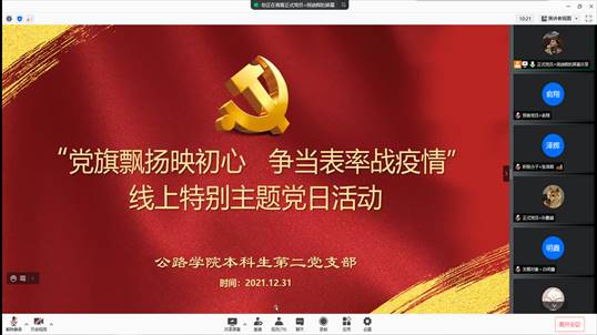 2021年12月31日晚19:00,beat365正版唯一官网必一本科生第二党支部全体支部成员、发展对象与入党积极分子开展了“党旗飘扬映初心争当表率战疫情”线上特别主题党日活动,本次活动由支部副书记周迪辉主持。活动过程中,支部副书记周迪辉总结了前一段期支部的抗疫工作,并规划和安排了下一阶段的抗疫志愿工作。同时,在本次抗疫志愿服务中表现突出的学生党员、发展对象与入党积极分子还分享了志愿服务经历。最后由支部书记贺志豪老师进行总结,贺志豪充分肯定了支部全体学生党员在前一段时期为学校抗疫工作所做的贡献,并鼓励大家在今后继续发挥党员先锋模范作用,为战胜疫情贡献力量。