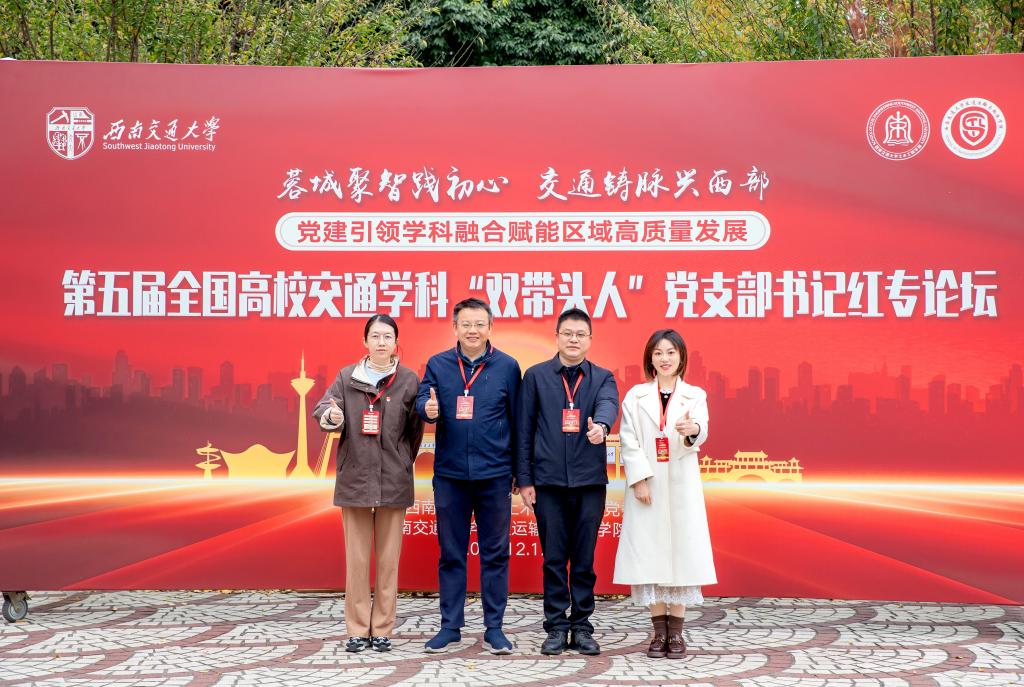 12月12日-12月14日,第五届全国高校交通学科“双带头人”教师党支部书记红专论坛在成都西南交通大学召开。本次论坛以“蓉城聚智践初心,交通铸脉兴西部——党建引领学科融合赋能区域高质量发展”为主题,旨在深入学习贯彻习近平新时代中国特色社会主义思想和党的二十大四中全会精神,落实新时代党的建设总要求和新时代党的组织路线,进一步加强高校交通学科“双带头人”教师党支部书记模式建设,推动党建工作与学科建设、人才培养、科学研究等中心工作同频共振、互促共进。beat365道路工程系第一党支部书记纪小平教授、桥梁工程系第二党支部书记王晓明教授、党委秘书郭洋、路桥研究生党支部书记许元珺应邀参会。